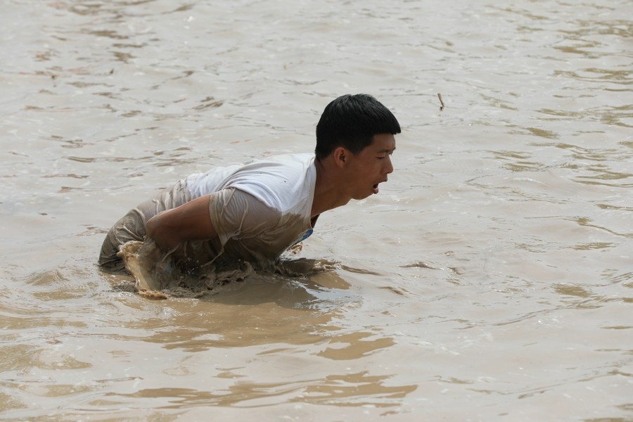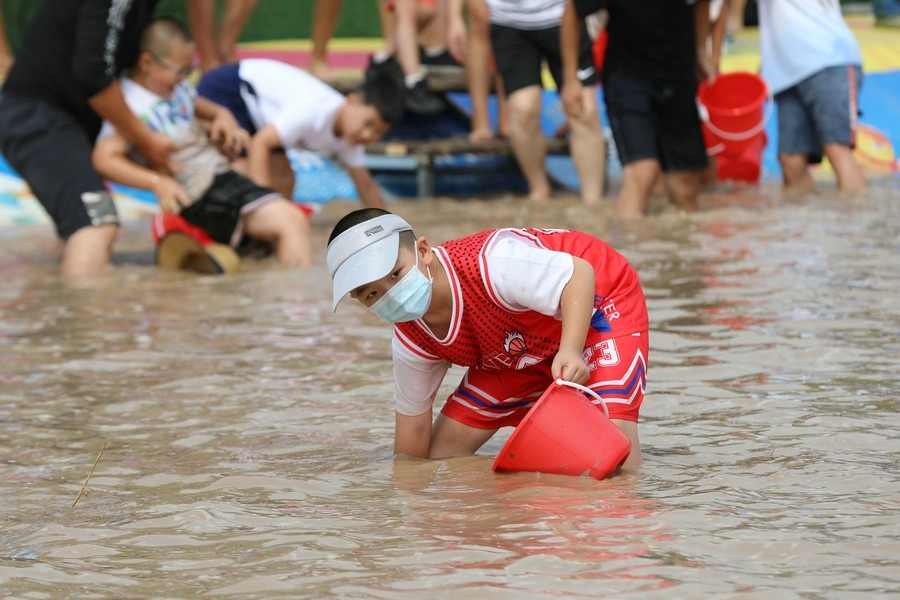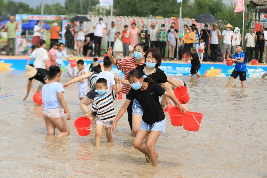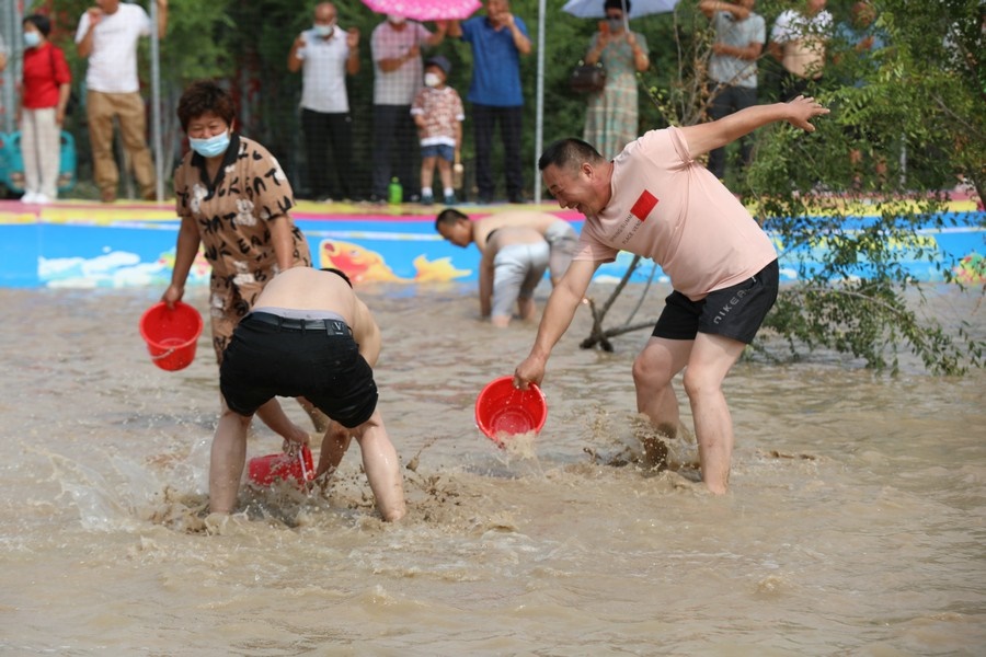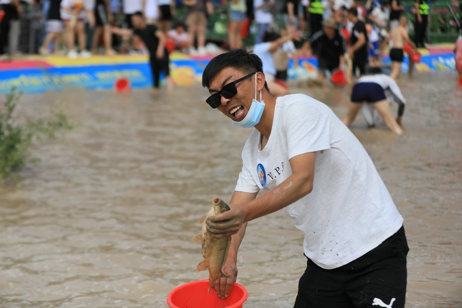 隨著主持人的一聲號(hào)令,來(lái)自呼和浩特市區(qū)和土默特左旗的眾多參與者,挽起褲管,光著腳丫,沖進(jìn)池塘,展開(kāi)了一場(chǎng)摸魚(yú)大比拼。