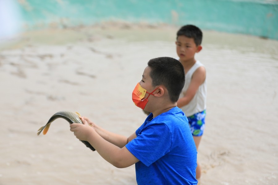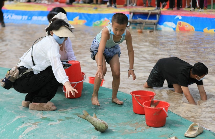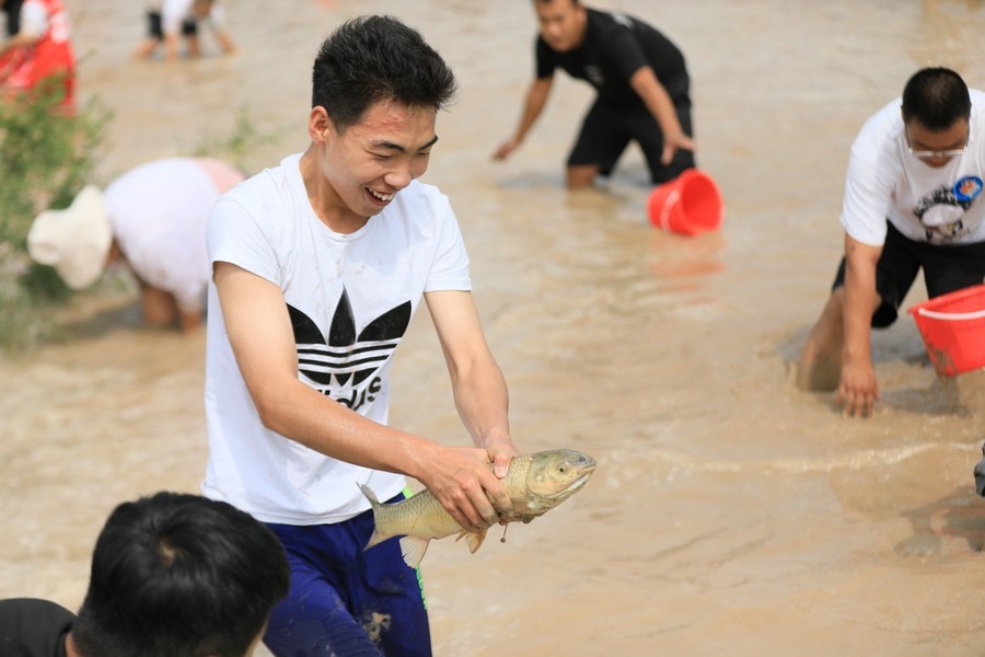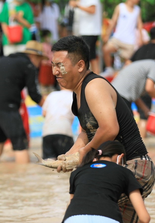“要抓魚(yú)的頭部,不能抓尾部!”池塘邊,除了吶喊助威聲,還有人幫忙支招。