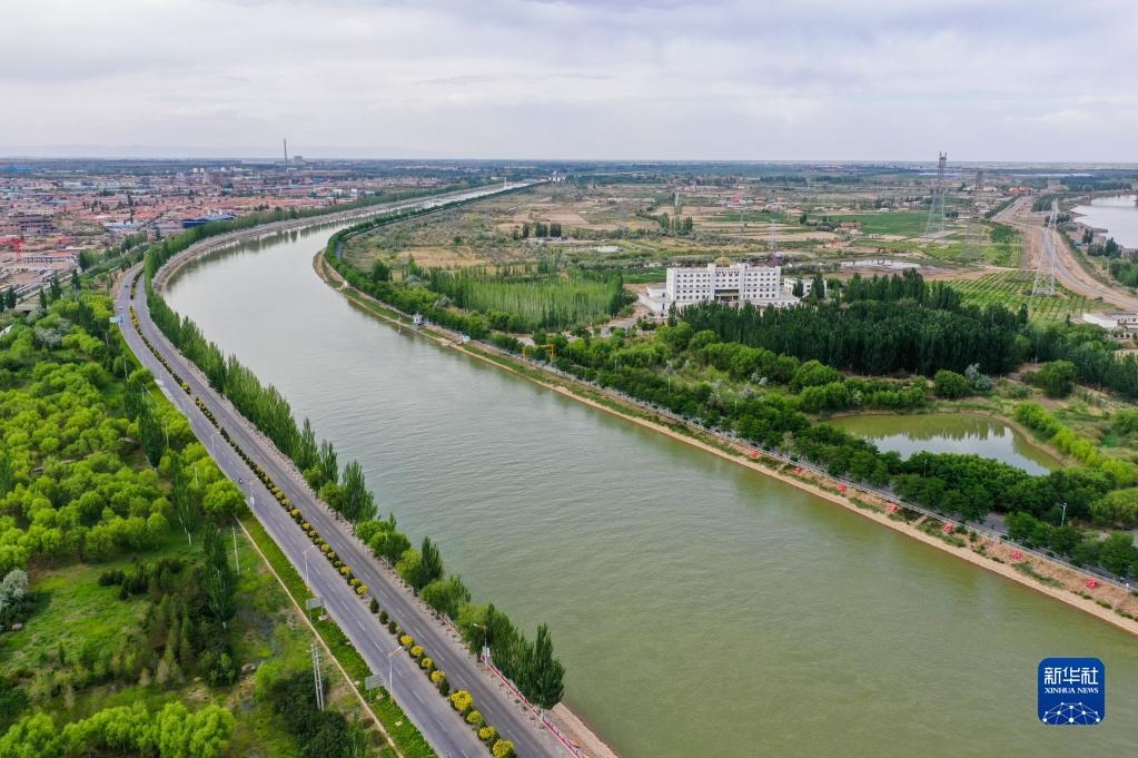 這是三盛公水利樞紐旁的黃河干渠(無人機照片,6月6日攝)。