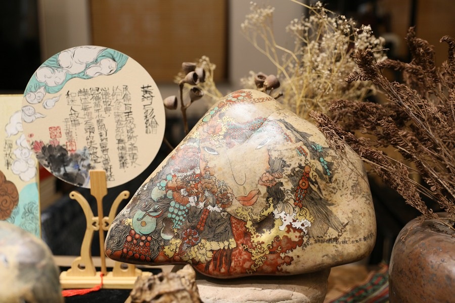 魯婷創(chuàng)作的黃河石彩繪作品 記者 張楊攝影