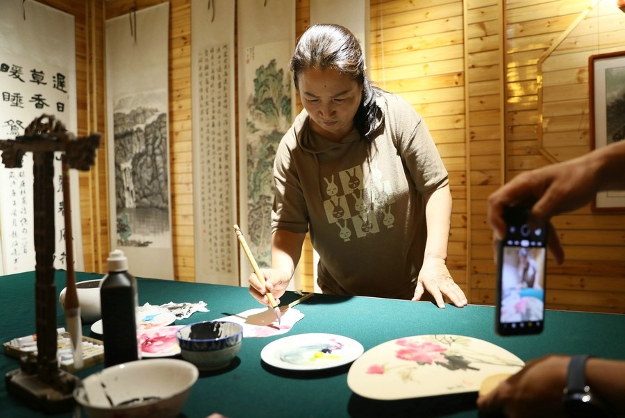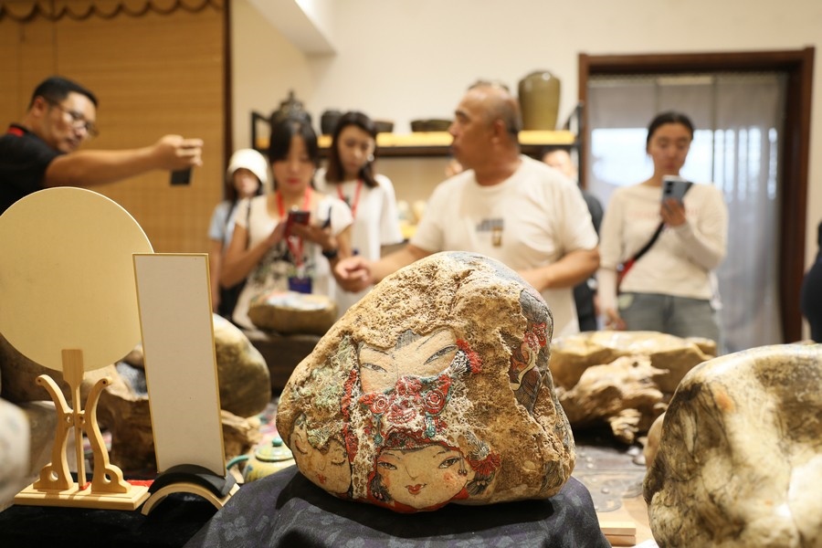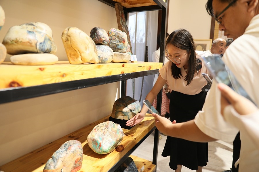 游客在魯婷黃河石彩繪工作室參觀 記者 張楊攝影