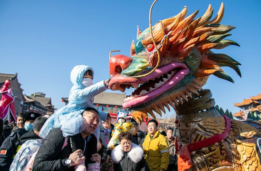 2024年2月15日,人們?cè)诤艉秃铺厥杏袢獏^(qū)塞上老街旅游休閑街區(qū)與國(guó)風(fēng)機(jī)甲拍照留影。丁根厚 攝