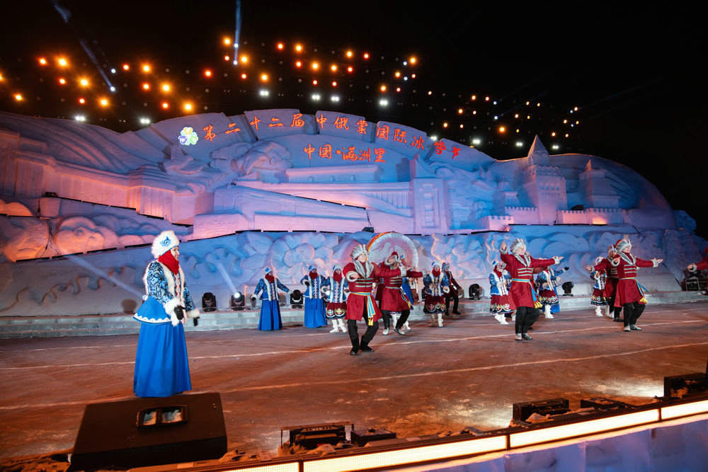 作為當(dāng)日重頭戲,冰雪節(jié)開幕式暨《冰雪芳華》主題樂園開園儀式于晚間精彩上演。中俄蒙三國表演團隊輪番登臺,用悠揚的歌聲、靈動的舞姿傳遞三國友誼,為現(xiàn)場觀眾獻上一場兼具民族風(fēng)情與國際視野的文化盛宴。