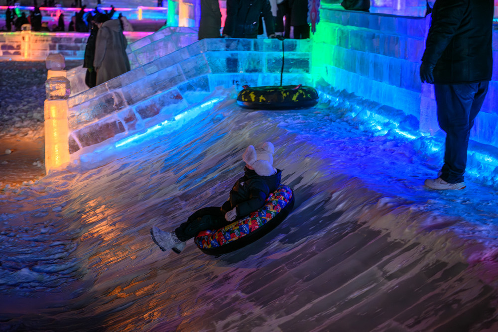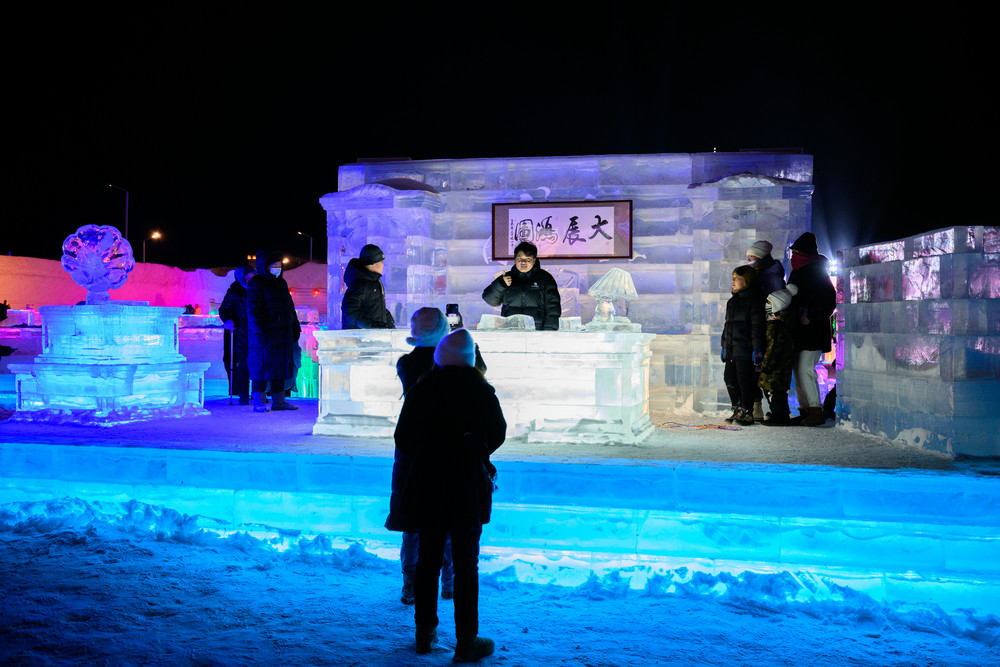 園區(qū)內(nèi)更是熱鬧非凡。中式“北國第一門”、俄式童話城堡、蒙式游牧風(fēng)情三大特色入口,成了游客打卡的首選地。258米長的中式主題雪墻鋪展著“萬里茶道”的傳奇故事,復(fù)古火車站、蒸汽機車雪雕復(fù)刻著中東鐵路的舊時光,隨手一拍都是自帶氛圍感的大片。冰雪滑梯、雪地碰碰球等十余項娛樂項目前排起了長隊,大人小孩都玩得不亦樂乎;蒙古包暖屋里,熱氣騰騰的奶茶、鮮燉烤梨香氣四溢,暖心又暖胃??萍几欣瓭M了游玩體驗,不少游客拿著手機掃碼體驗語言冰書冰墻,中俄蒙常用語一學(xué)就會,還有炫彩音樂噴泉冰柱打造互動琴鍵裝置,時光之門光幕呈現(xiàn)科幻特效。