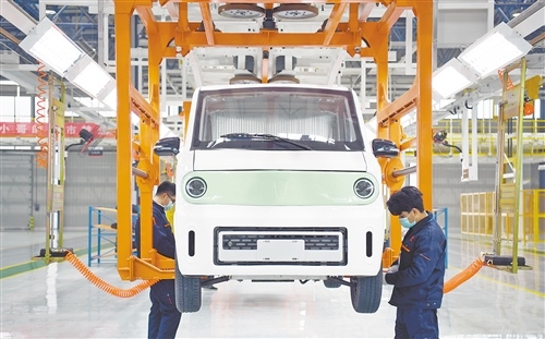 12月12日,工人在總裝車(chē)間組裝新能源快遞車(chē)。當(dāng)日,由山東豪馳智能汽車(chē)有限公司投資、中建電力建設(shè)有限公司承建的智能新能源商用車(chē)制造基地在山東濟(jì)南市萊蕪區(qū)投產(chǎn)。新華社記者 金良快攝