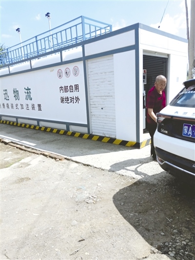 6月29日16時許,記者來到回民區(qū)塞外安康新居小區(qū)。該小區(qū)旁邊是一處老舊廠區(qū)。記者開車進(jìn)入這個老舊廠區(qū)看到,在大門的左手邊有一臺撬裝式加注裝置。這時,一名中年婦女告訴記者,加油往里走,這臺裝置壞了。隨后,記者開車又往廠區(qū)院里走了約50米,在路的右側(cè)有一臺撬裝式加注裝置,這臺裝置距離塞外安康新居小區(qū)的居民樓很近(如圖二)。記者把車停在加注裝置旁邊,一位老人熟練地打開車的油箱蓋,問記者加多少錢的油。加油過程中,老人告訴記者,“這個撬裝式加注裝置是向安監(jiān)部門申請的,供單位內(nèi)部用油?!庇浾咴儐枺骸凹热皇枪﹩挝粌?nèi)部使用,那對外加油不怕被查?”老人說:“執(zhí)法部門查不查,那是老板的事兒。因為油便宜,來這里加油的人不少?!边@里92號汽油每升為4.3元。
