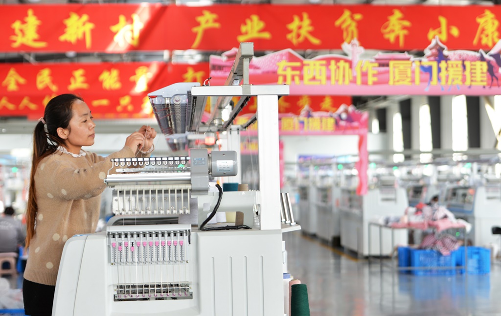 近年來(lái),在東西部扶貧協(xié)作機(jī)制下,福建省廈門市幫助甘肅省臨夏回族自治州引進(jìn)服裝鞋帽、戶外用品、文化旅游、農(nóng)產(chǎn)品深加工等企業(yè),吸納當(dāng)?shù)剞r(nóng)民就地就近就業(yè)。新華社發(fā)(史有東 攝)