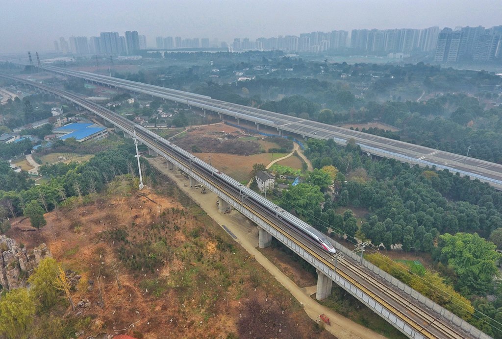 2020年12月24日,“復(fù)興號(hào)CR400AF動(dòng)車組”首次在成渝地區(qū)投入運(yùn)營(yíng),自此兩地間的高鐵通達(dá)時(shí)間縮短至62分鐘,實(shí)現(xiàn)成渝間高鐵公交化運(yùn)營(yíng)1小時(shí)通達(dá)。成渝高鐵是我國(guó)“八縱八橫”高鐵主通道沿江通道的重要組成部分,是成渝地區(qū)雙城經(jīng)濟(jì)圈城際鐵路網(wǎng)的主骨架。新華社記者 劉坤 攝