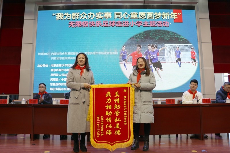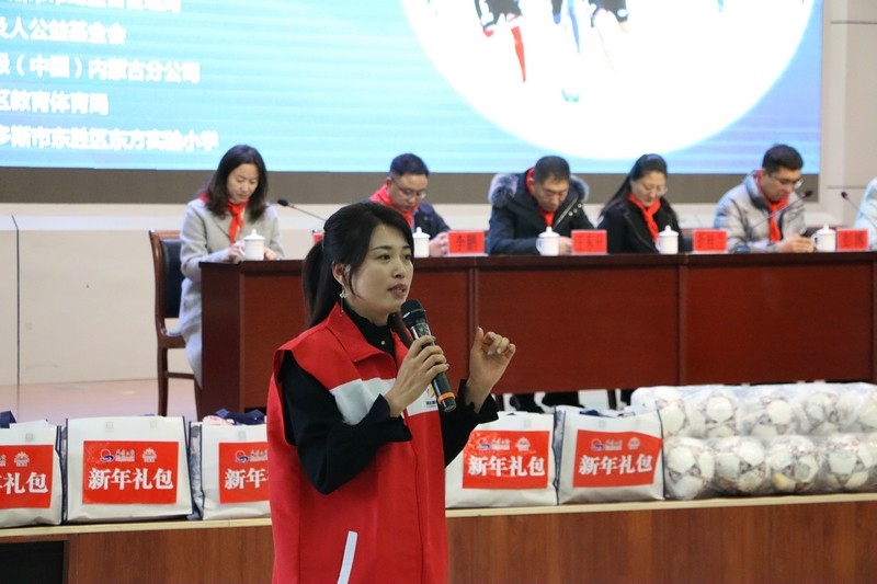 鄂爾多斯市市場監(jiān)督管理局副局長折桂蘭在公益活動(dòng)上致辭,希望同學(xué)們不要單一地關(guān)注學(xué)習(xí),而要德、智、體、美全面發(fā)展,提升綜合能力,同時(shí)用優(yōu)異的成績來回報(bào)每一個(gè)愛心人士的無私奉獻(xiàn)與幫助。也希望同學(xué)們分配好時(shí)間,能夠熱愛足球,熱愛自已感興趣的運(yùn)動(dòng)、愛好,這會(huì)讓生活更加多姿多彩,也希望同學(xué)們今后能多方面為國家貢獻(xiàn)自己的力量,成為各行業(yè)里的優(yōu)秀人才。