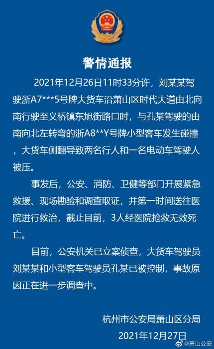 中新網(wǎng)12月27日電 杭州市公安局蕭山區(qū)分局27日通報(bào),12月26日11時(shí)33分許,一大貨車(chē)與一小型客車(chē)在蕭山區(qū)一路口發(fā)生碰撞,大貨車(chē)側(cè)翻導(dǎo)致兩名行人和一名電動(dòng)車(chē)駕駛?cè)吮粔?。截至目前?人經(jīng)醫(yī)院搶救無(wú)效死亡。