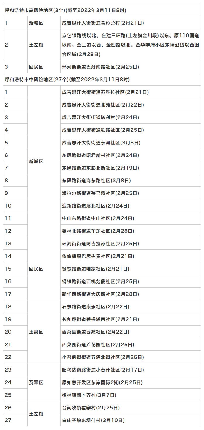 按照國務(wù)院聯(lián)防聯(lián)控機制《關(guān)于調(diào)整新冠肺炎疫情分區(qū)分級標準實施精準管控措施的通知》規(guī)定,經(jīng)專家組評估,市指揮部研究決定,決定于3月11日8時起,將新城區(qū)保和少鎮(zhèn)野馬圖村,回民區(qū)環(huán)河街街道太平街社區(qū),玉泉區(qū)長和廊街道大召社區(qū)、小召前街街道建華北街社區(qū)調(diào)整為低風(fēng)險地區(qū)。其他地區(qū)風(fēng)險等級不變。