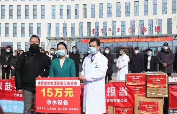 2月25日,由內(nèi)蒙古自治區(qū)工商聯(lián)組織,內(nèi)蒙古水處理設備行業(yè)協(xié)會聯(lián)合山東省凈水專委會,向內(nèi)蒙古第三醫(yī)院捐贈價值15萬凈水設備和100件蘇打水。當天,內(nèi)蒙古自治區(qū)黨委統(tǒng)戰(zhàn)部副部長、自治區(qū)工商聯(lián)黨組書記梁淑琴,內(nèi)蒙古自治區(qū)工商聯(lián)黨組成員白春艷,一級巡視員屈晨然、二級巡視員呂萬海、武軍等出席捐贈活動。