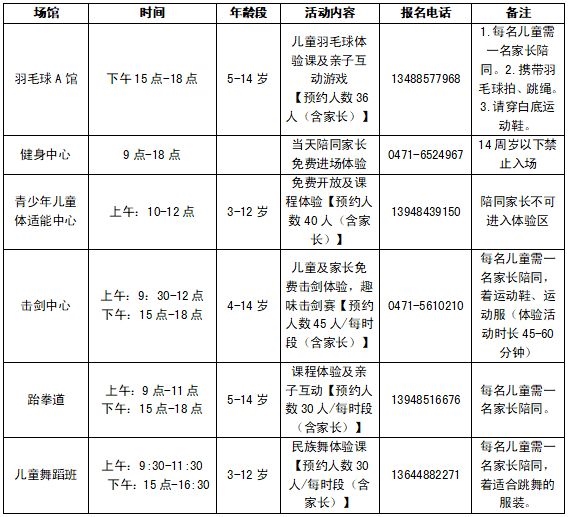 記者從內(nèi)蒙古體育館了解到,六一兒童節(jié)當日,該館羽毛球、健身中心、青少年兒童體適能中心、擊劍中心、跆拳道、兒童舞蹈班為14周歲以下的兒童準備了豐富的免費體驗活動項目。