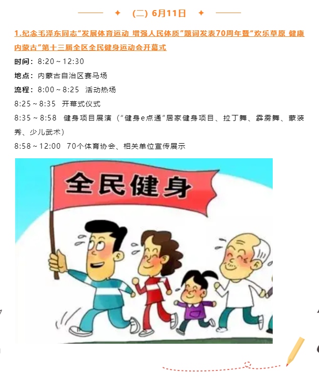 記者從自治區(qū)體育局獲悉,紀念毛澤東同志“發(fā)展體育運動,增強人民體質(zhì)”題詞70周年暨“歡樂草原健康內(nèi)蒙古”第十三屆全區(qū)全民健身運動會將于6月10日至11日歡樂開啟。
