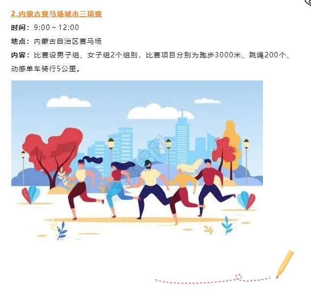 本次運動會認真踐行“以人民為中心”辦賽理念,創(chuàng)新探索聚集少、規(guī)模小、符合大眾運動口味的內(nèi)蒙古賽馬場城市三項賽,包含跑步3000米、跳繩200個和動感單車騎行5公里3個項目比賽。此外,還將舉辦公園系列挑戰(zhàn)賽、“跑遍青城”系列路跑活動等,讓群眾在暢享運動的過程中盡情領略城市綠景的清新曼妙,進一步推動全民健身與全民健康深度融合。