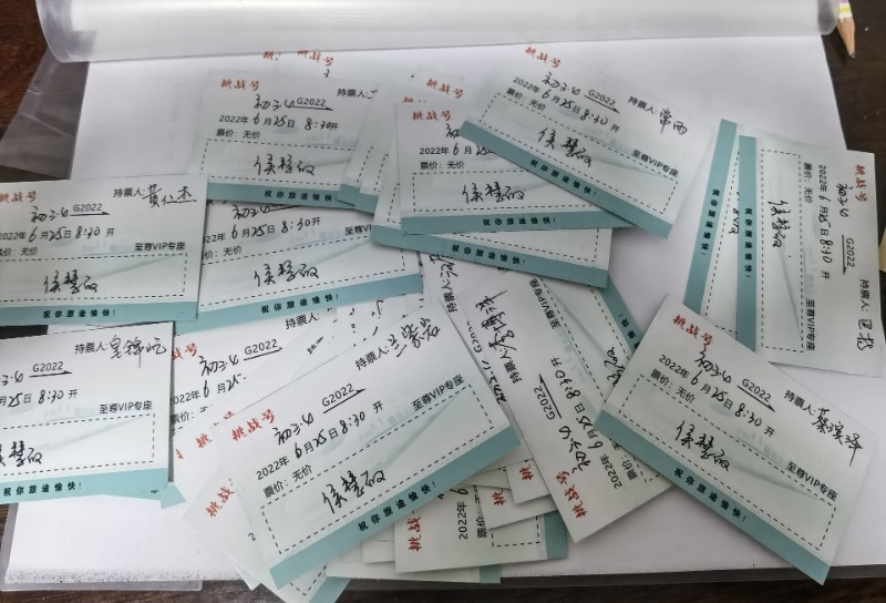 6月20日,呼和浩特市第五中學(xué)初三(4)班班主任侯慧敏老師給班里57名學(xué)生的手寫“告別信”刷屏朋友圈,紙短情長,愛意滿滿。每封信箋做成車票的樣式,正面寫著車次:“挑戰(zhàn)號”G2022;時間:2022年6月25日8時30分;座位:至尊VIP專座;票價:無價?!敖K點站”并未填寫。侯慧敏說,那是孩子們的夢想,需要靠他們自己來完成。當(dāng)天的畢業(yè)班會上,當(dāng)每個學(xué)生打開信箋,滿滿的回憶和濃濃的情誼不禁讓孩子們潸然淚下。