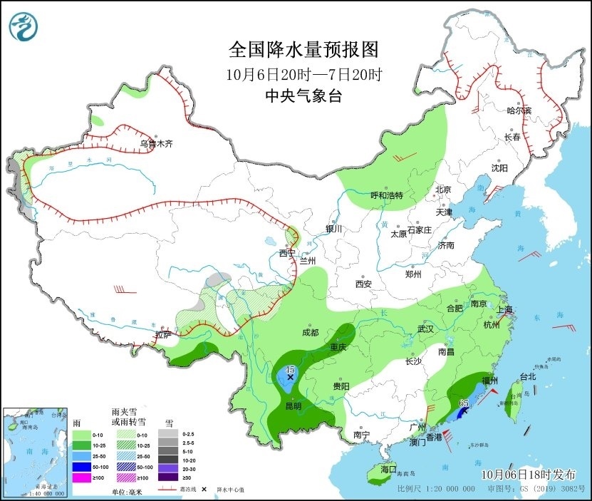10月8日08時至9日08時,內蒙古東南部、黑龍江中部、吉林西部、遼寧、安徽中南部、湖北西南部、川西高原北部、四川南部、重慶、貴州中西部、西藏東南部以及海南島、臺灣島大部等地部分地區(qū)有中到大雨,其中,內蒙古東南部、遼寧中北部、臺灣島東部等地局地有暴雨或大暴雨(100~180毫米)。內蒙古中西部部分地區(qū)有4~6級風。渤海、黃海北部和東部海域、東海南部海域、臺灣海峽、南海東北部海域將有6~7級、陣風8級風。
