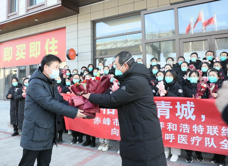 新華融媒、北疆新聞網(wǎng)消息(記者 張楊)“自呼和浩特疫情發(fā)生以來(lái),50多個(gè)晝夜,白衣天使們逆行參戰(zhàn),奮戰(zhàn)在抗疫第一線,為呼和浩特保衛(wèi)戰(zhàn)貢獻(xiàn)了自己的力量,體現(xiàn)了白衣天使的責(zé)任和擔(dān)當(dāng),更展現(xiàn)了赤峰人奮勇拼搏的精神,圓滿完成了援呼醫(yī)療各項(xiàng)任務(wù),沒(méi)有辜負(fù)家鄉(xiāng)人民的重托,大家辛苦啦!”12月5日,在赤峰援呼普通病區(qū)醫(yī)療隊(duì)圓滿完成各項(xiàng)任務(wù),即將凱旋之際,赤峰市人民政府駐呼和浩特聯(lián)絡(luò)處和內(nèi)蒙古赤峰商會(huì),共同到醫(yī)療隊(duì)駐地看望醫(yī)療隊(duì)員。赤峰市人民政府駐呼和浩特聯(lián)絡(luò)處副主任李子輝,代表駐呼聯(lián)絡(luò)處和內(nèi)蒙古赤峰商會(huì)在呼和浩特地區(qū)鄉(xiāng)友,向援呼醫(yī)療隊(duì)領(lǐng)隊(duì)羅俊祥等醫(yī)護(hù)人員獻(xiàn)上鮮花和對(duì)家鄉(xiāng)同胞的親切問(wèn)候。