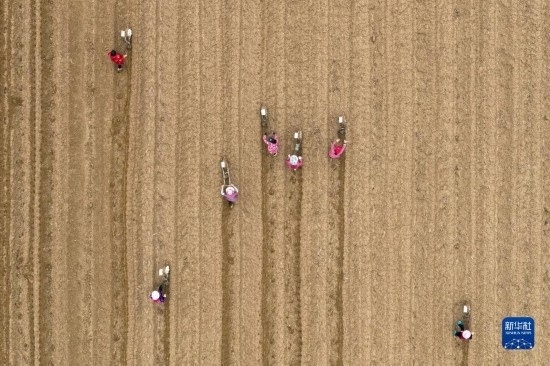 2月16日,村民在湖北省武漢市經(jīng)開區(qū)鄧南街田間進行播種作業(yè)(無人機照片)。