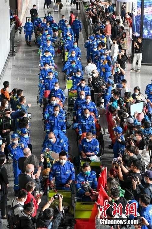 2月19日,廣東省廣州市,藍(lán)天救援隊(duì)赴土耳其隊(duì)員抵達(dá)廣州白云機(jī)場。當(dāng)日,100余名藍(lán)天救援隊(duì)赴土耳其隊(duì)員搭乘CZ8066航班返抵廣州。中新社記者 陳驥旻 攝