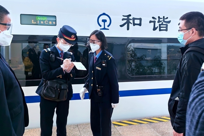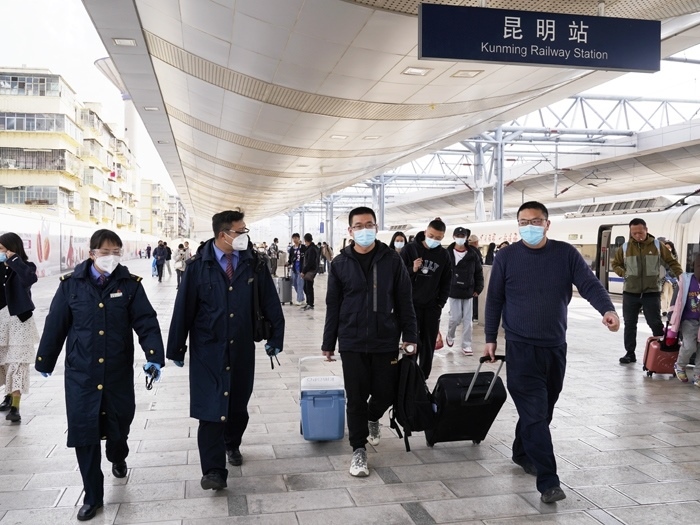 云縣站工作人員引導(dǎo)醫(yī)務(wù)人員進(jìn)入站臺乘坐動(dòng)車。中國鐵路昆明局集團(tuán)有限公司供圖