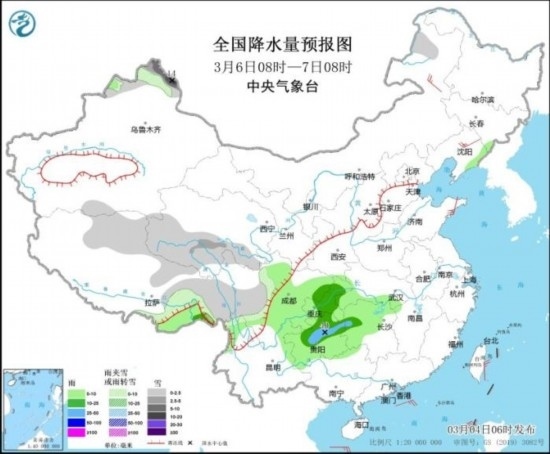 全國(guó)降水量預(yù)報(bào)圖(3月6日08時(shí)-7日08時(shí))