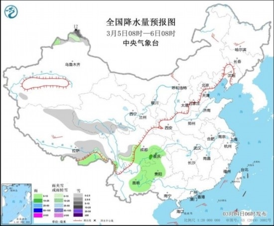 全國(guó)降水量預(yù)報(bào)圖(3月5日08時(shí)-6日08時(shí))