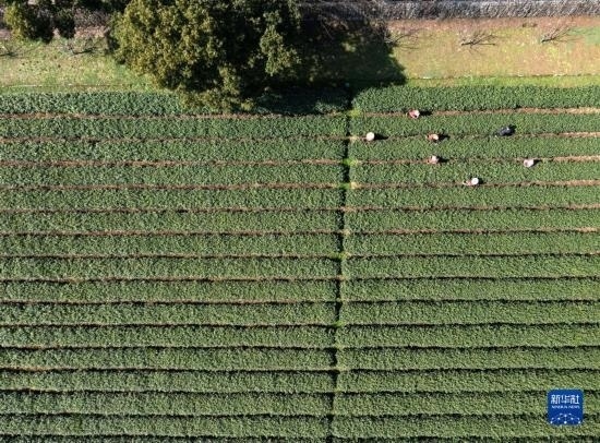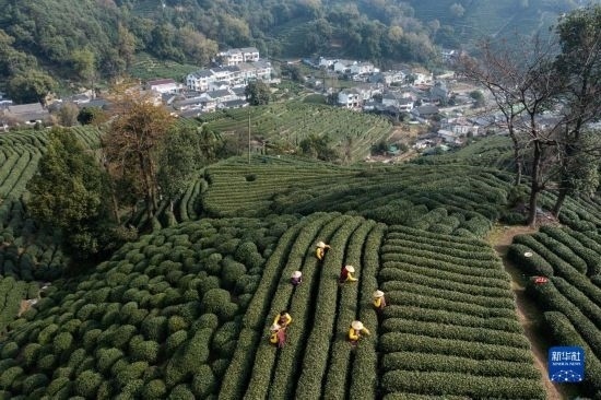 3月13日,梅家塢村的茶農(nóng)在采摘西湖龍井“明前茶”(無(wú)人機(jī)照片)。