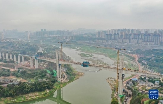 3月18日在位于四川省瀘州市拍攝的渝昆高鐵瀘州沱江特大橋主跨合龍施工現(xiàn)場(chǎng)(無(wú)人機(jī)照片)。