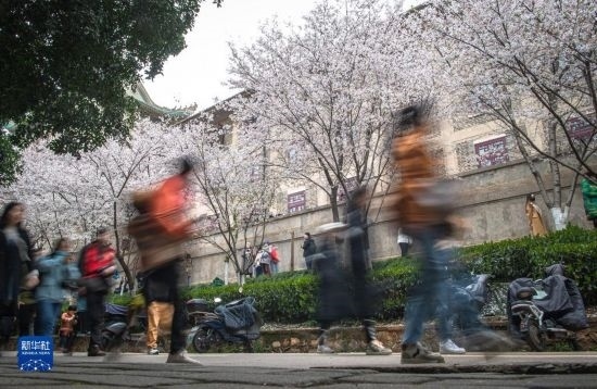 3月18日,來自各地的抗疫醫(yī)護(hù)人員及家屬在武漢大學(xué)校園共賞櫻。