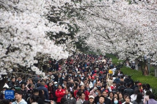 當(dāng)日,武漢大學(xué)舉行抗疫醫(yī)護(hù)賞櫻專場(chǎng)。珞珈山下,來自全國各地的1.6萬余名抗疫醫(yī)護(hù)人員及家屬赴約賞櫻。