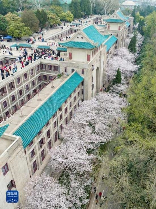3月18日,來自各地的抗疫醫(yī)護(hù)人員及家屬在武漢大學(xué)校園賞櫻(無人機(jī)照片)。