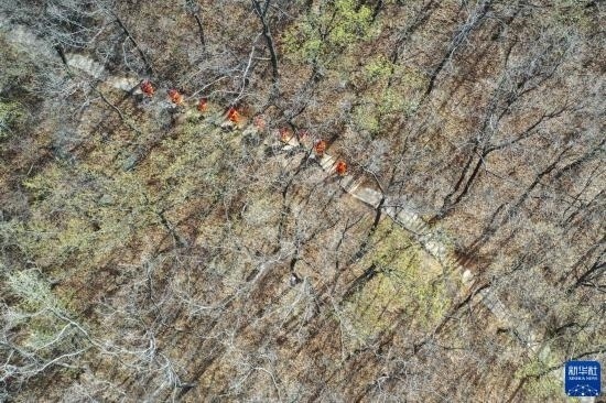3月15日,長清區(qū)國有蓮臺(tái)山林場防火中隊(duì)隊(duì)員在林區(qū)巡護(hù)(無人機(jī)照片)。