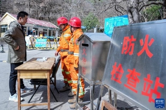 3月15日,長清區(qū)國有蓮臺(tái)山林場防火中隊(duì)隊(duì)員在林區(qū)入口檢查火源。