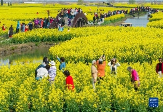 近日,江蘇興化千垛菜花風(fēng)景區(qū)溝河交錯(cuò)圍成的垛田上,油菜花次第開(kāi)放,吸引人們前來(lái)踏青賞花。
