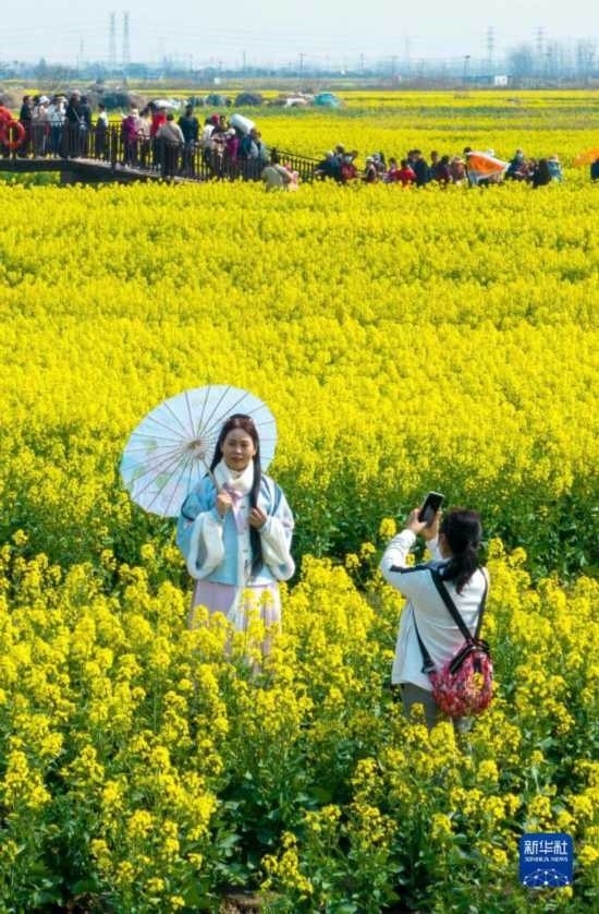 3月19日,游客在江蘇興化千垛菜花風(fēng)景區(qū)賞花拍照(無(wú)人機(jī)照片)。