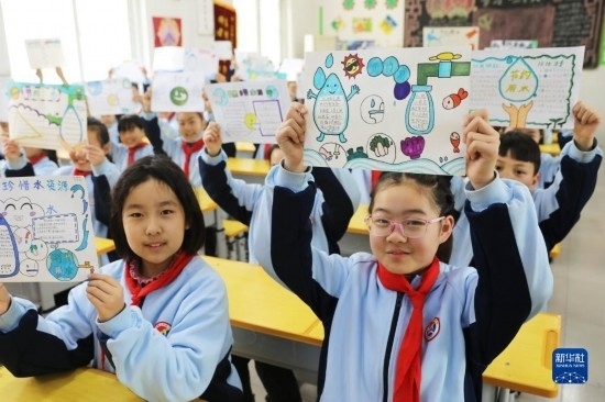 3月22日,河南省平頂山市寶豐縣山河路小學(xué)學(xué)生展示自己制作的節(jié)水護(hù)水畫報。