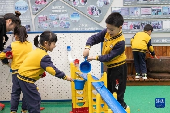 3月22日,浙江省諸暨市實驗幼兒園的小朋友在體驗?zāi)M水循環(huán)裝置。