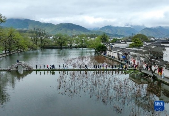 3月24日,游客在黟縣宏村南湖游覽(無人機照片)。