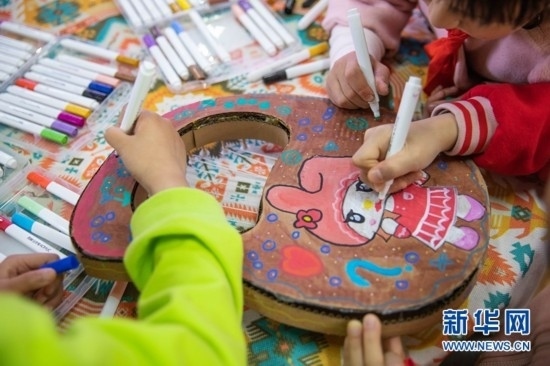 在成都市金牛區(qū)西北街社區(qū)的服務(wù)大廳一角,一群孩子正為紙板制作的各族樂器繪畫著色。