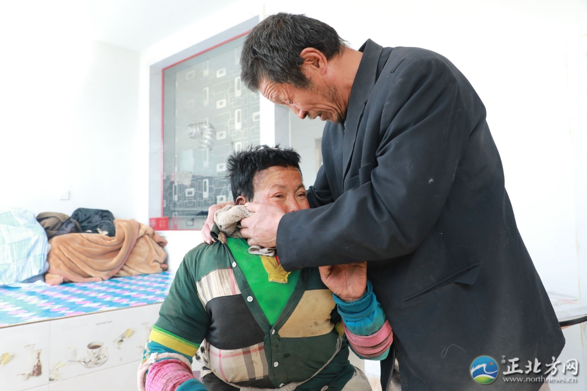 在采訪間隙,何蘭鎖的妻子王林愛回到了家,見到有陌生人顯得很局促。王林愛患有精神疾病,說話顛三倒四。何蘭鎖拿起毛巾,溫柔地為妻子擦拭沾滿灰塵的臉和手,端出早早做好的飯放在桌上:“快吃吧,有你最愛吃的咸菜。”“林愛其實命最苦了,啥也懂不得,我要不在了,她一個人可咋辦呀。我現在最大的心愿是希望能讓她去接受治療。”何蘭鎖止不住地哽咽道。