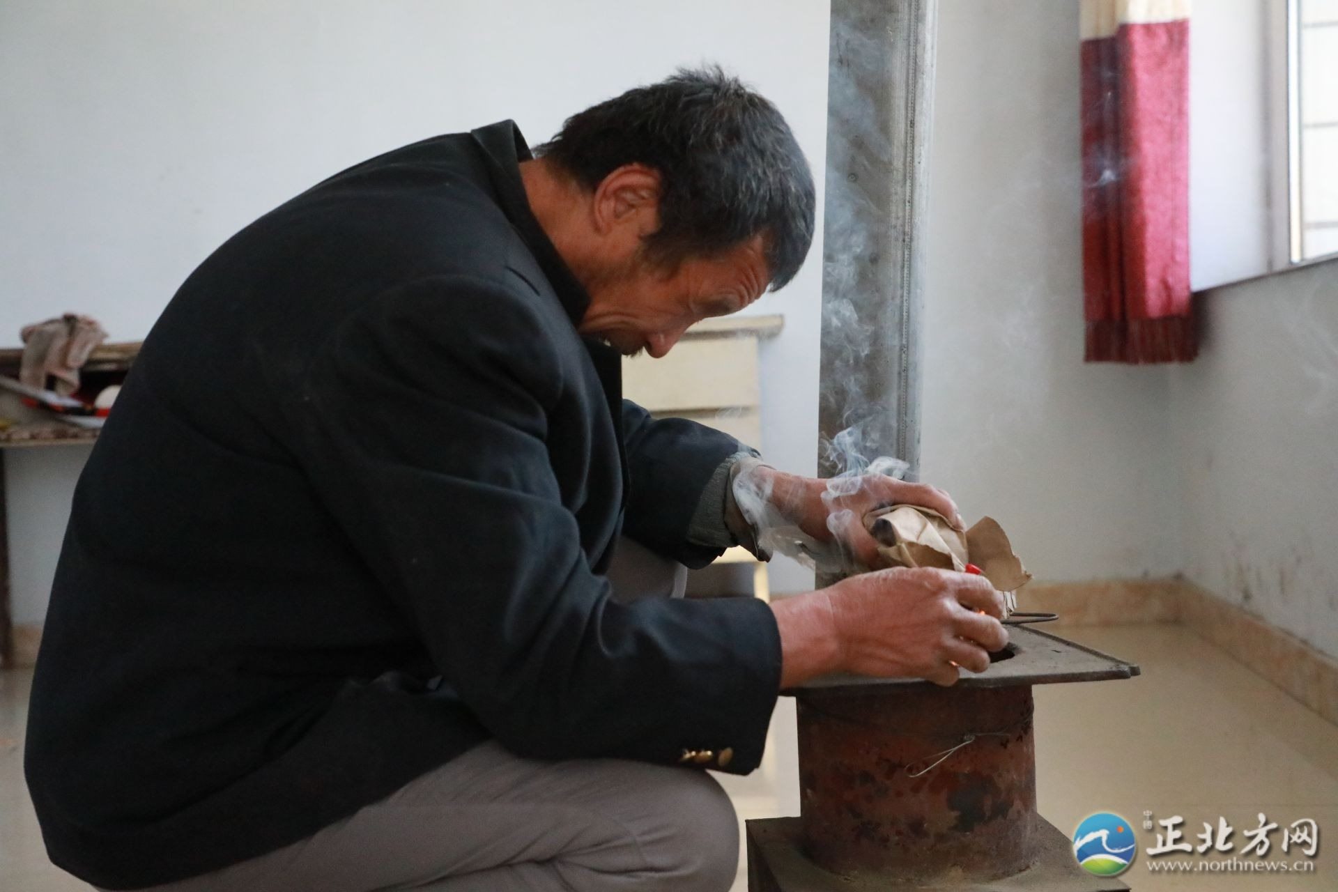 何蘭鎖63歲,黝黑的臉膛,兩個眼窩深陷,看不到眼珠。聽到記者來采訪,他熱情地把記者讓進屋,摸索著拿起水壺倒了兩杯熱茶,“你們稍坐一坐,家里有點冷?!焙翁m鎖笑起來眉眼彎彎,說著,又轉身拿著錘子,熟門熟路地進入涼房去打炭,開始生火。