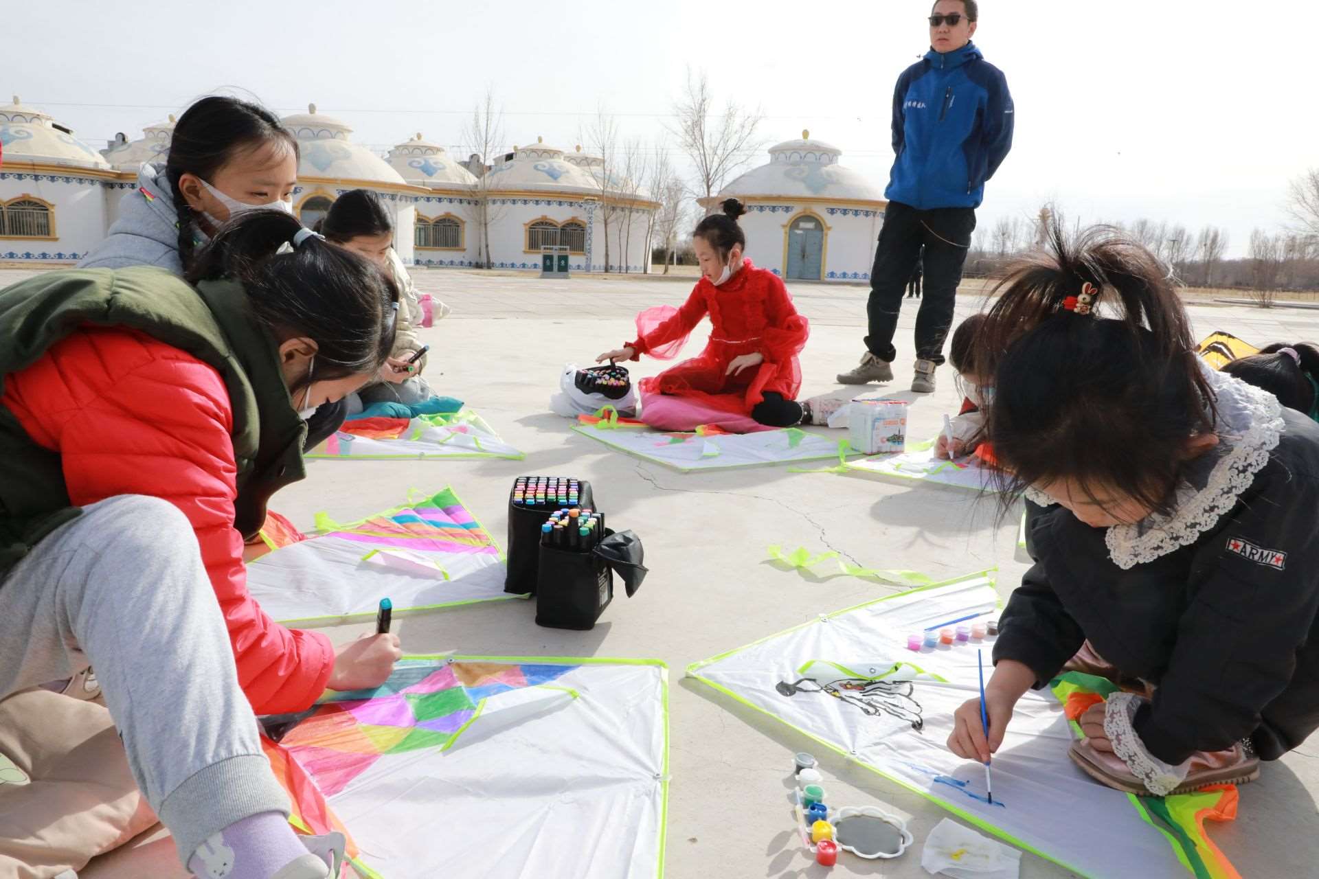 活動現場,呼和浩特市風箏協(xié)會還特地準備了20個空白風箏,讓孩子們充分發(fā)揮想象力,動手繪制自己喜歡的圖案。沐浴著溫暖的春光,小記者們拿出事先準備好的水彩筆或者顏料,或趴或坐,認真構思,有的在風箏上畫上了粉色的郁金香,有的畫上了振翅飛舞的蝴蝶,有的畫上了美麗的白雪公主,還有的涂鴉上喜歡的色塊,他們用五彩斑斕的顏色點綴創(chuàng)意,裝點自己喜歡的風箏。一個小時的功夫,一個個獨具創(chuàng)意的風箏在小記者們的巧手繪制中完成了。在郝偉老師的指導下,小記者們把風箏安裝好,接上線,舉行了一場小型風箏比賽?!巴?,成功了,起飛了!”只見數十只色彩各異的風箏隨風飛上天空,你爭我趕,越飛越高,小記者們忍不住發(fā)出歡呼聲,臉上洋溢著開心地笑容。