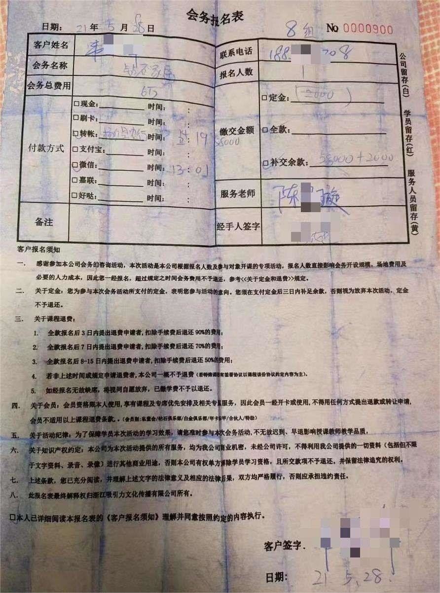 “他們要求我去寧波主會(huì)場(chǎng)協(xié)商退款,我沒敢去?!备畸愂稣f擔(dān)心,“上課的時(shí)候,楊濤鳴說自己好幾億身家,黑白通吃,說學(xué)員不刷卡就沒有格局,我怕被報(bào)復(fù),不敢報(bào)警。”