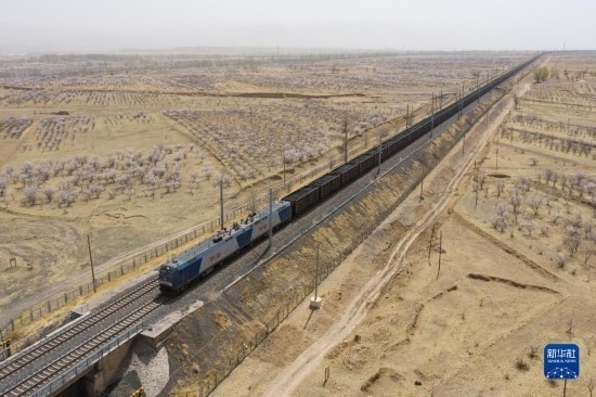 重載列車行駛在大秦鐵路上(4月11日攝,無(wú)人機(jī)照片)。