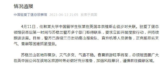 ·一名中國留學(xué)生在英國徒步時(shí)失聯(lián),中領(lǐng)館:已聯(lián)系警方,正抓緊搜救。