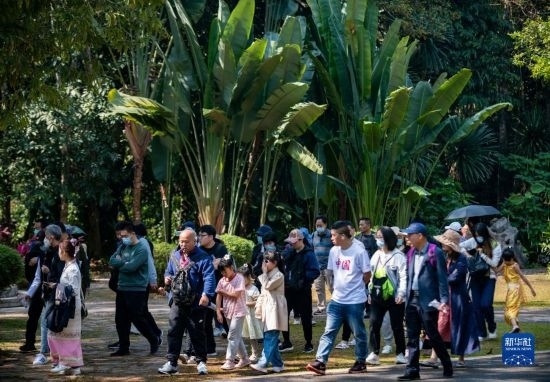 游客在位于云南省西雙版納州勐臘縣勐侖鎮(zhèn)的中國(guó)科學(xué)院西雙版納熱帶植物園內(nèi)游覽(2023年2月12日攝)。