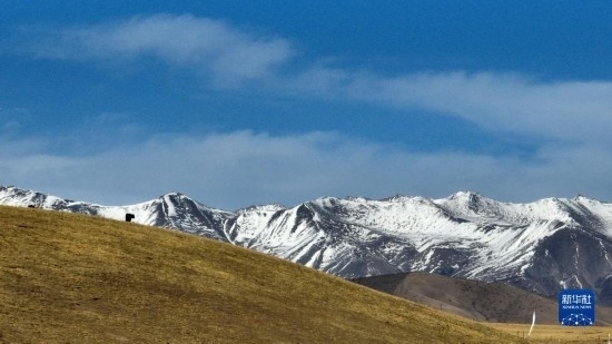 4月17日,在青海省海北藏族自治州門源回族自治縣皇城蒙古族鄉(xiāng),一群牦牛在祁連山腹地的草場上活動。