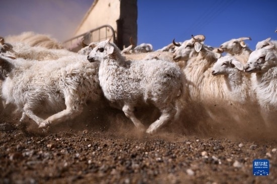 4月14日,在青海省海北藏族自治州剛察縣泉吉鄉(xiāng)寧夏村,牧民拉寶家的羊群離開羊圈前往草場。