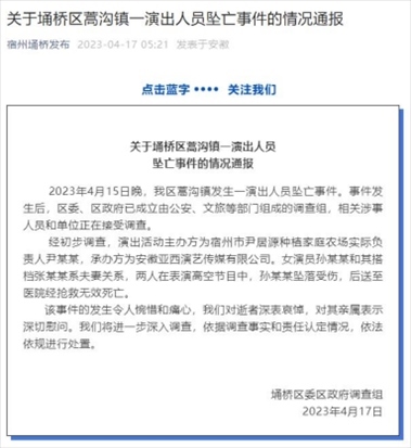·安徽宿州埇橋區(qū)委區(qū)政府調(diào)查組通報“雜技演員墜亡”:涉事人員和單位接受調(diào)查。